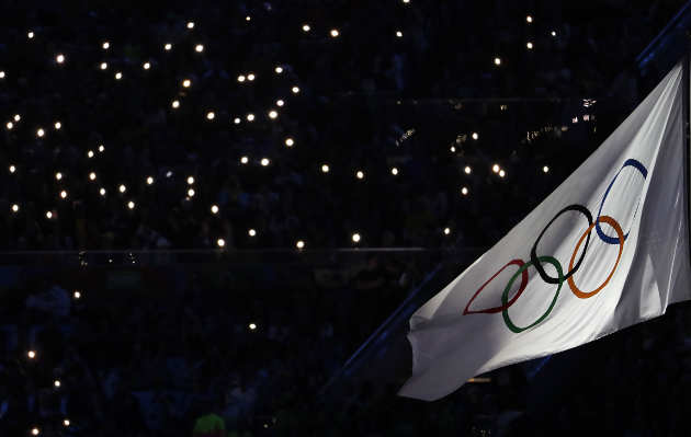 Smartphone lights illuminate the ranks behind the Olympic flag during the closing ceremony at the Maracana Stadium in Rio de Janeiro on Sunday. AP